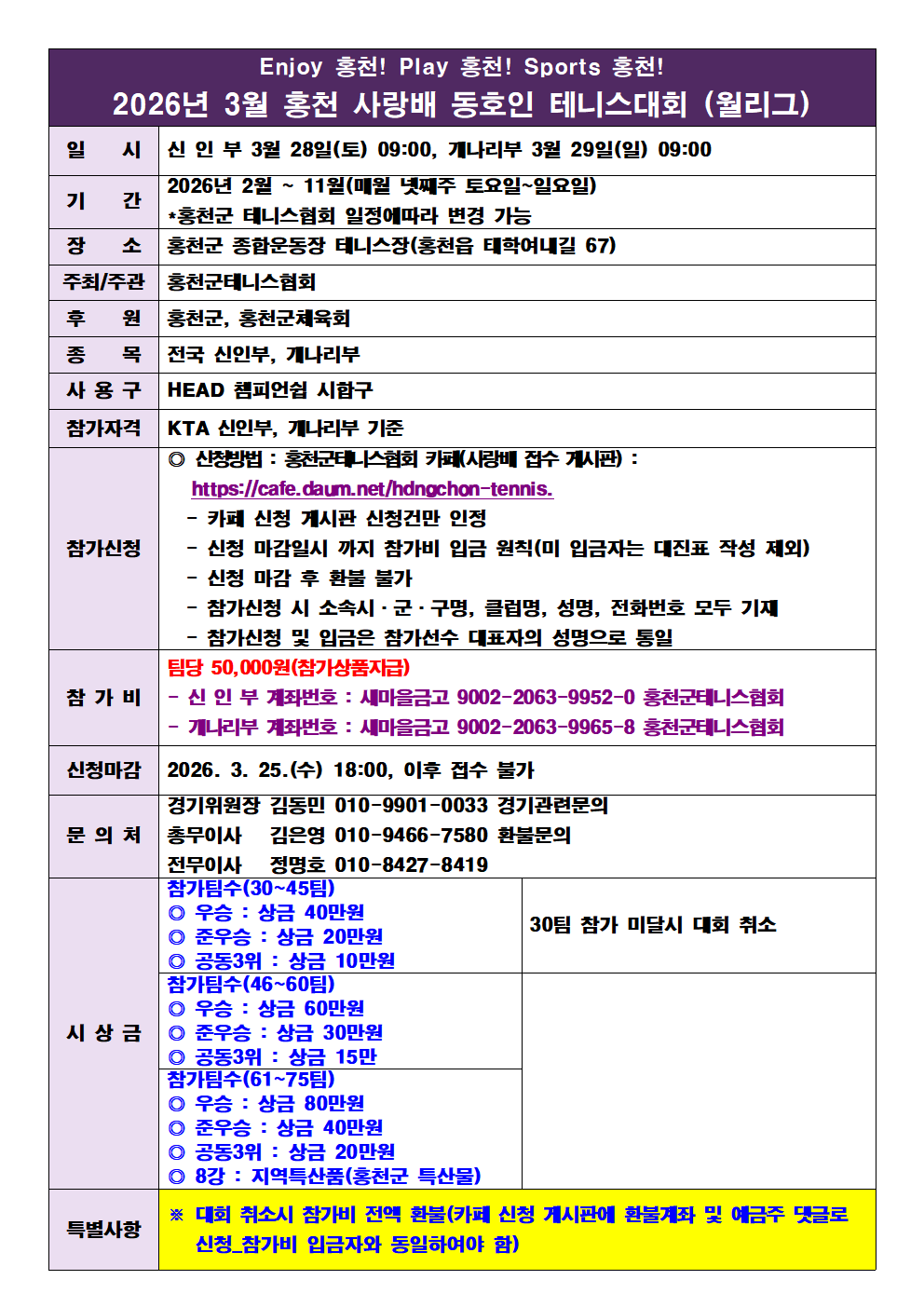 홍천사랑배 테니스대회 깊은 관심을 가져주신 테니스동호인 여러분께 감사 인시드립니다 변경된 요강사항은 기존 참가 접수마감을 목요일에서 수요일로 하루 앞당겼습니다 경기당일 출전신고는 별도에 출전신고 접수처 에서 등록하는걸로 변경되었습니다. 다시한번 홍천사랑배 테니스대회에 참가하시는 모든 테니스동호인 여러분께 감사 인사드리며 참가하시는 테니스동호인들의 실력향상 을 위해서 많은 노력을 하도록 하겠습니다 |