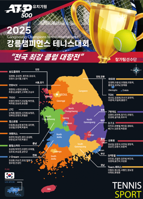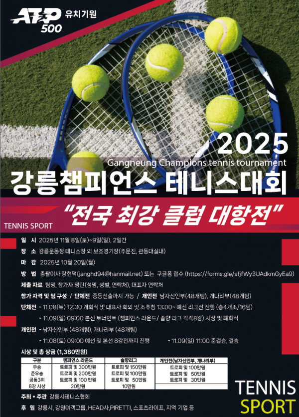 2025 강릉 챔피언스 테니스대회 알림일시: 2025년 11월 8일(토) ~ 9일(일), 2일간장소: 강릉테니스장 외 보조경기장