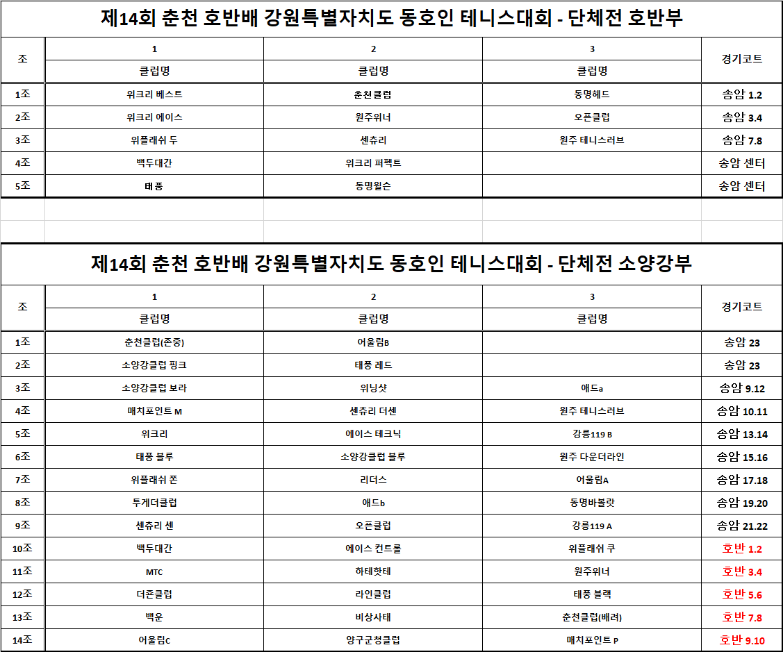 해당 코트로 이동하셔서, 출전신고(기념품수령) 하시고, 경기 진행 하시면 됩니다.